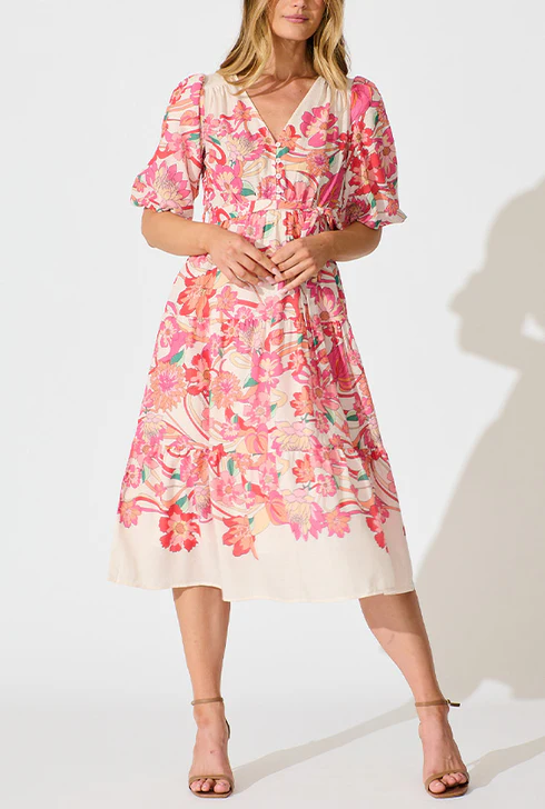 Krystia Dress In Cream With Multi Print With Ric Rac Trim