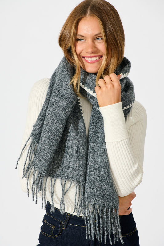 Estella Scarf in Grey with White Blanket Stitch Detail