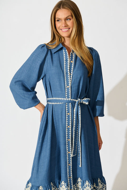 Whisper Midi Shirt Dress in Blue Chambray Embroidery