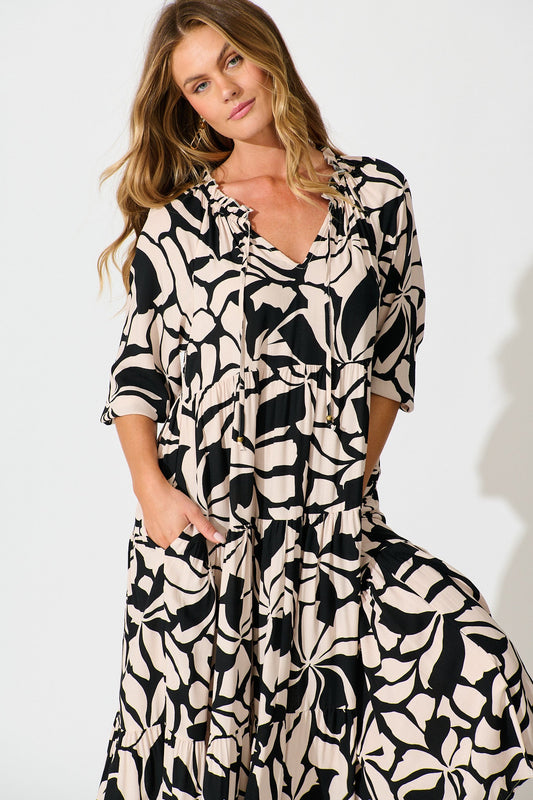 Heidi Maxi Dress in Black and Cream Geometric Print