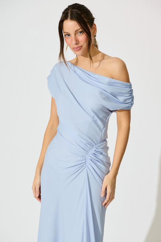 Marielle Off Shoulder Maxi Dress in Dusty Blue Chiffon