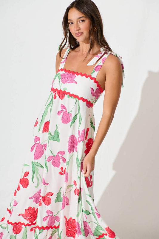 Valentina Maxi Sundress in White With Pink Multi Floral