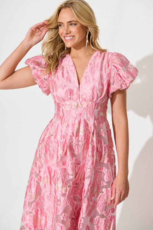 Cherish Midi Dress in Pink Floral Organza Jacquard