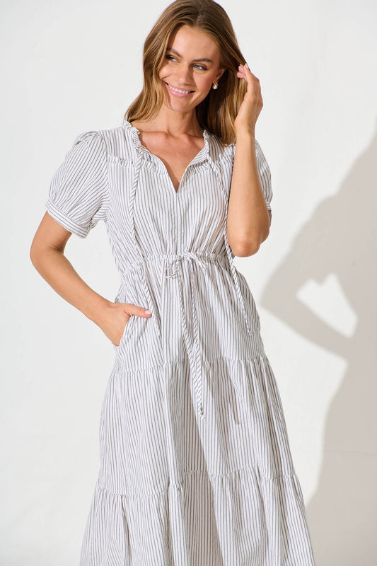 Micah Midi Dress in Blue and White Stripe Cotton Blend