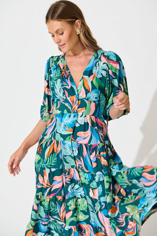 Copenhagen Midi Dress in Teal with Multi Leaf Print