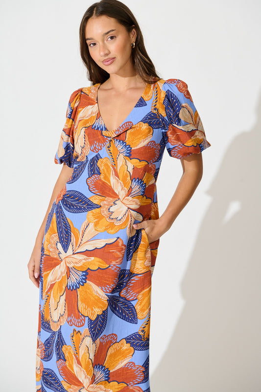 Fatal Attraction Midi Dress in Blue with Multi Print Chiffon