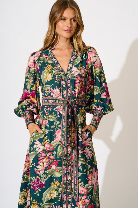 Evelina Midi Dress in Green with Multi Floral