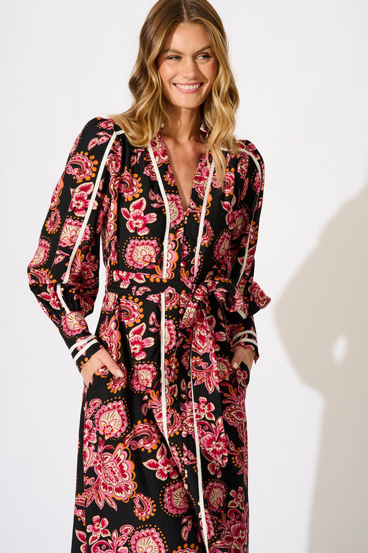 Harlee Midi Shirt Dress in Black with Pink Floral