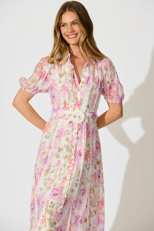 Safiya Maxi Shirt Dress in White with Pink Floral
