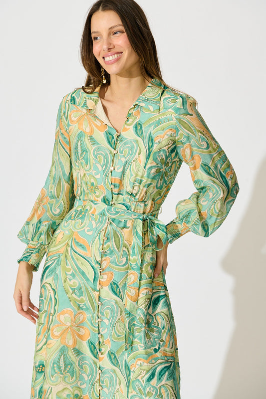 Mystic Mirage Midi Shirt Dress in Multi Green Print