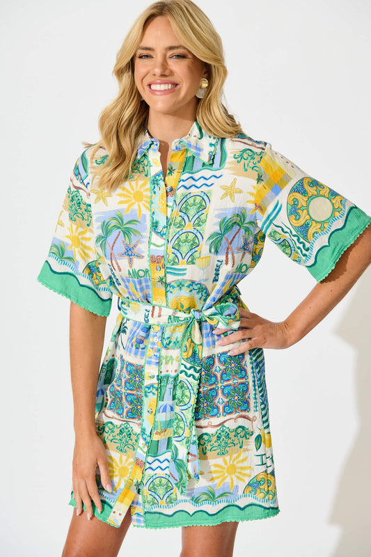 Maroa Shirt Dress in Green Print with Ric Rac Trim