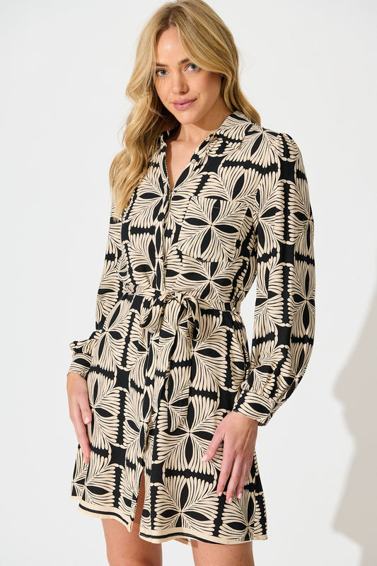 Marisol Shirt Dress in Cream with Black Tile Print