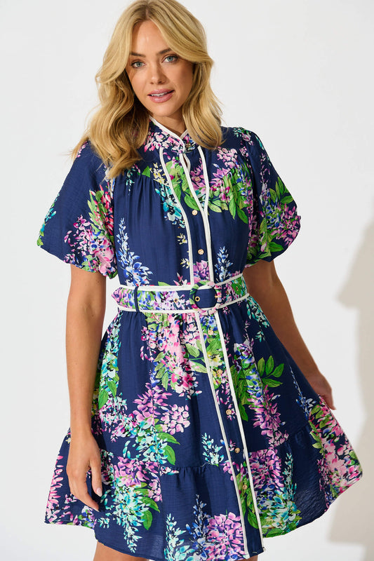Maybelle Shirt Dress in Navy Wisteria Print with Piping Trim