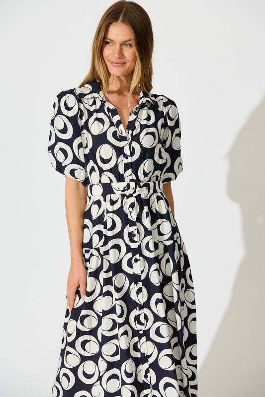 Aspyn Midi Shirt Dress in Black and White Geometric Satin
