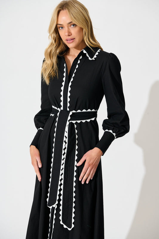 Lilyfield Midi Shirt Dress in Black with Contrast Trim Cotton