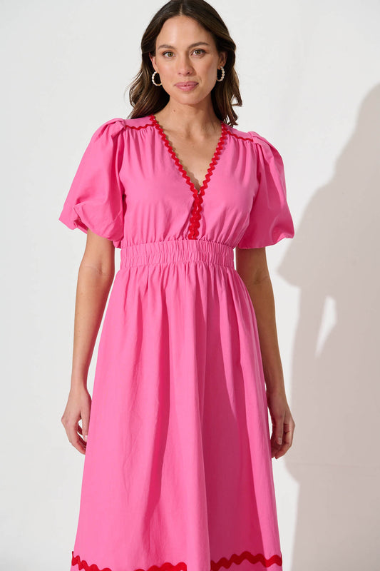 Indi Maxi Dress In Pink With Red Ric Rac Trim Cotton