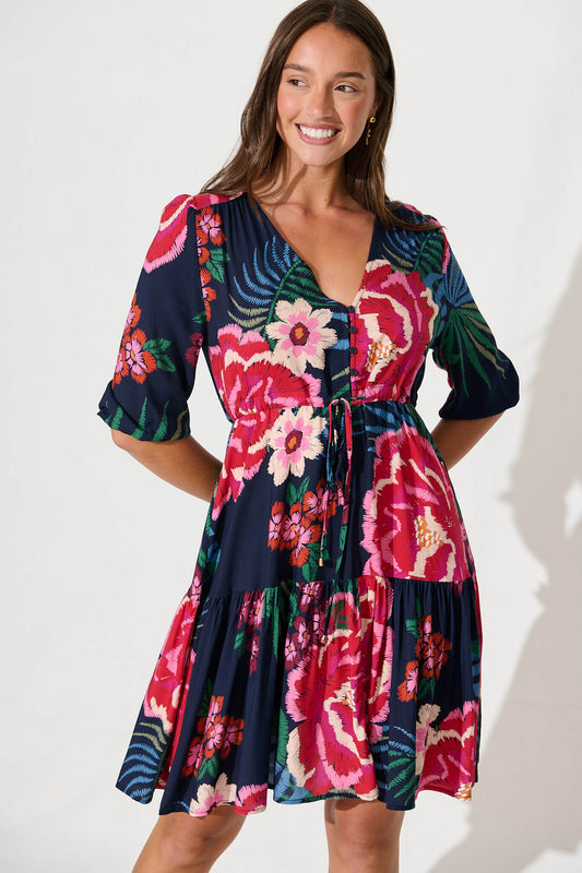 Rimini Dress In Blue Multi Print With Pink Ric Rac Trim