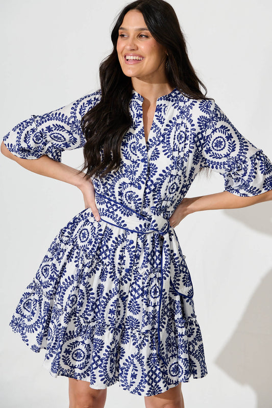 Rylee Midi Dress in White with Blue Floral Linen Blend