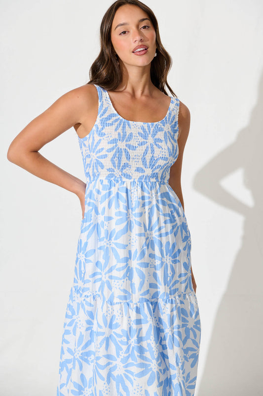 Caribbean Midi Dress In White with Blue Flower