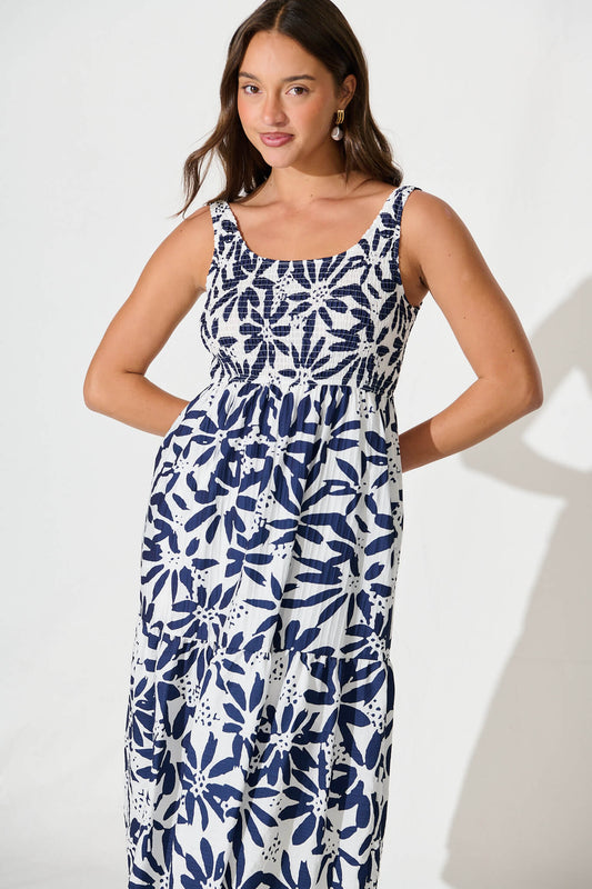 Caribbean Midi Dress In White with Navy Flower