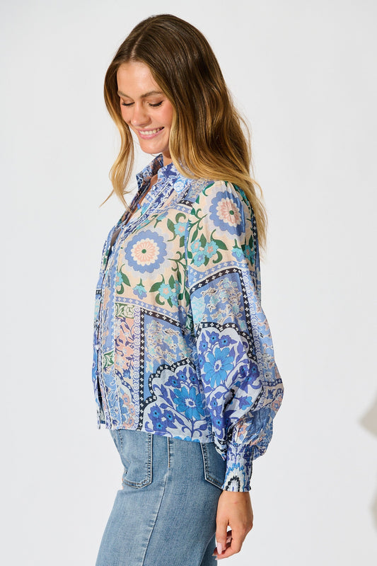 Emma Shirt in Multi Blue Cotton Blend
