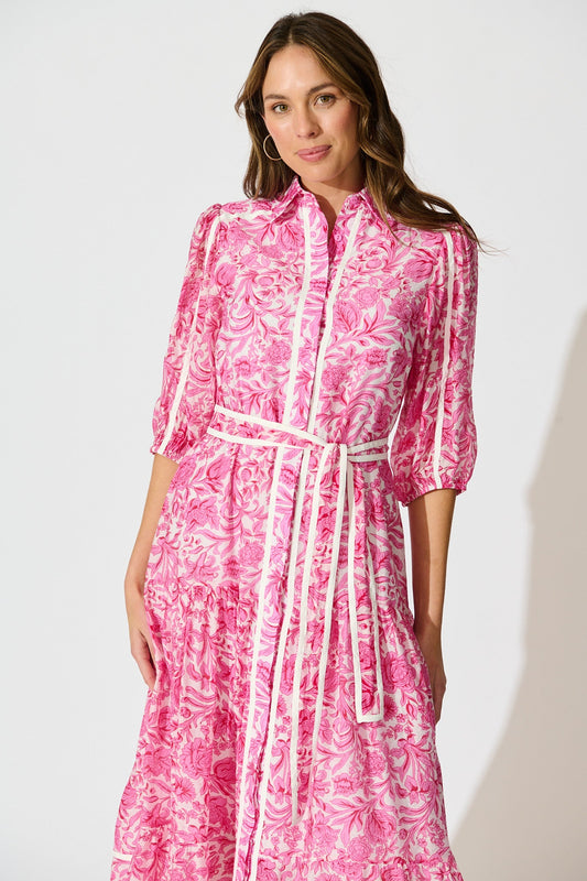 Zora Maxi Shirt Dress in Pink Floral Cotton Blend