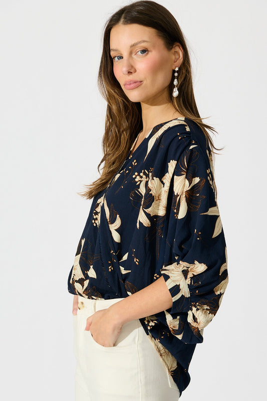 Marliboo Mock Wrap Top in Navy with Cream Floral