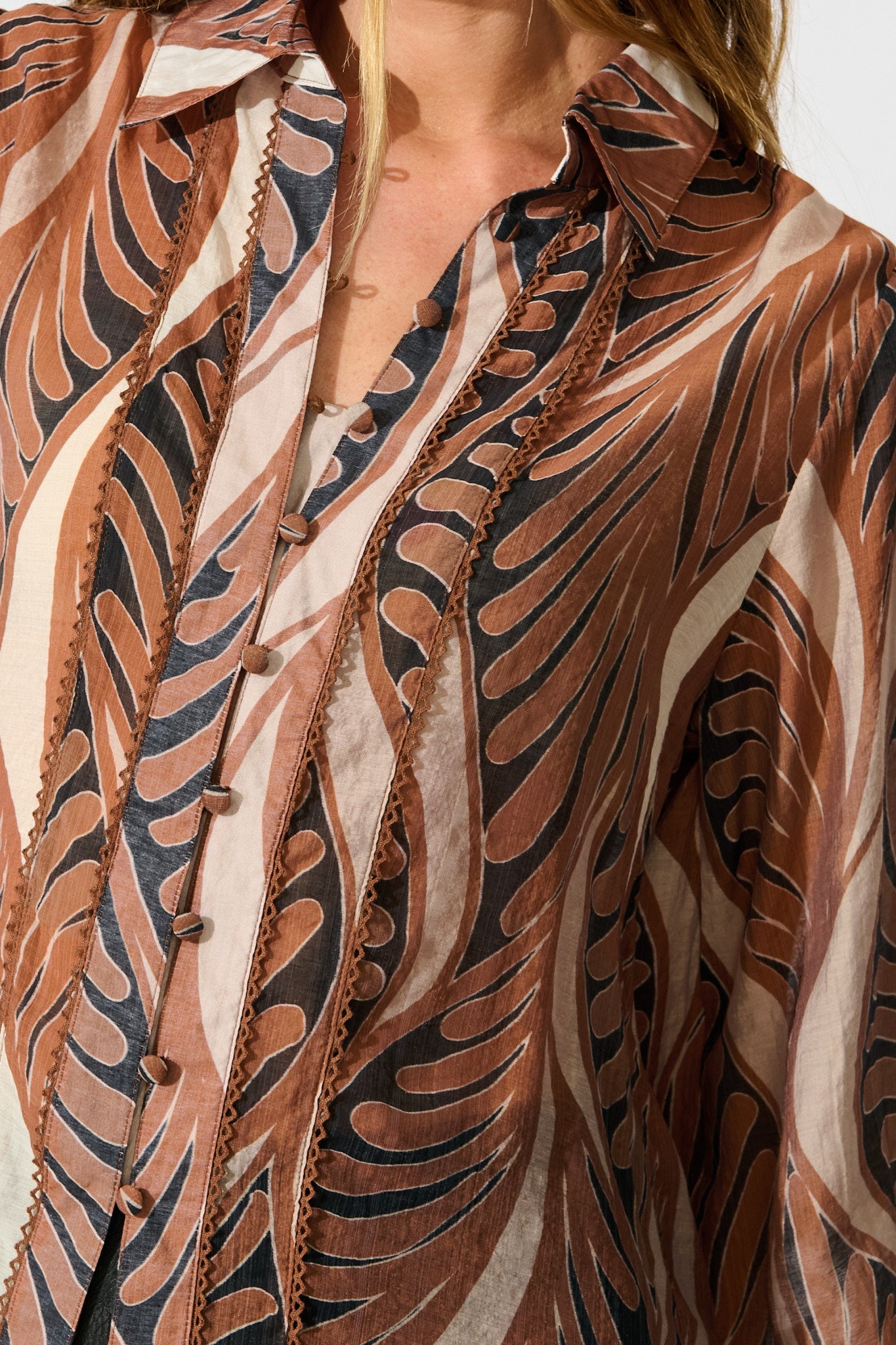 Effortlessly refined with a touch of romantic detail—the Emma Shirt in Brown with Tan Cotton Blend is a timeless wardrobe essential. Perfect for everyday wear or elevated styling, this lightweight shirt combines earthy tones with textural accents that bring quiet elegance to your look.