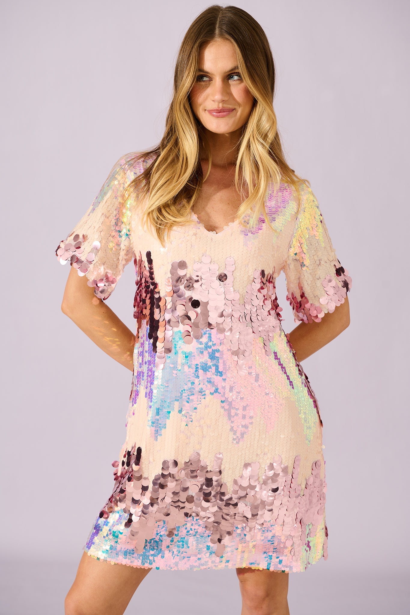 Make an entrance in the Glitter Siren Dress in Pink Multi Sequin – a mini that demands attention. Covered in tiny sequins for a continuous shimmer, its A-line cut and short sleeves balance bold sparkle with effortless wearability. Whether you’re celebrating a hens’ weekend or toasting at a cocktail soirée, this dress is your ticket to unforgettable photos and glowing confidence.