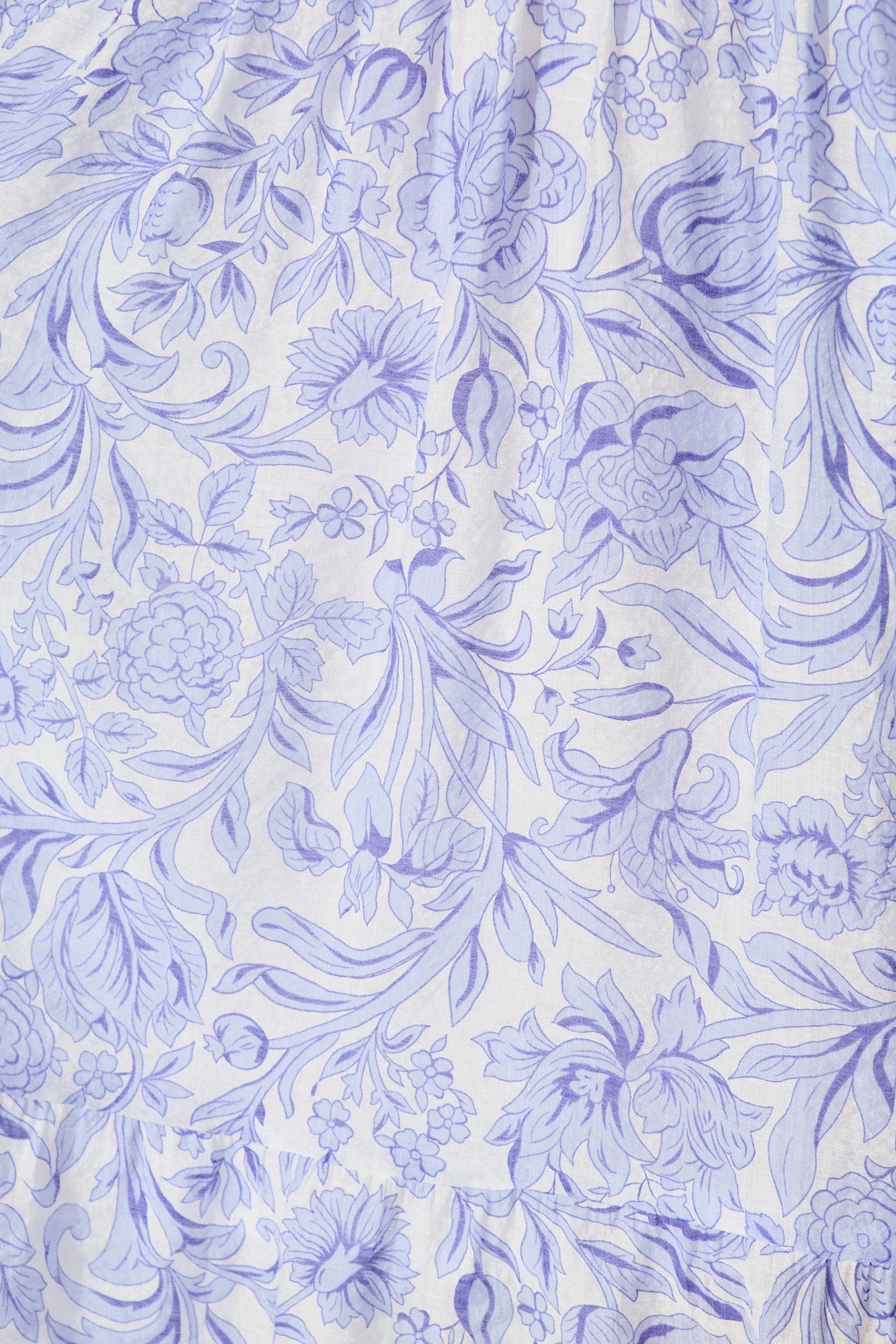 Featuring a vibrant blue floral print, the tiered maxi skirt adds soft movement, while contrast trimming along the button placket and sleeves offers a refined finish. A separate waist tie lets you define the silhouette or wear it loose for a relaxed, airy feel. The half-length sleeves are completed with encased elastic cuffs, balancing comfort with a touch of structure.
